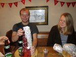 Sonntag war dann unser letzter Tag mit Jacob und Anne und den mussten wir noch ordentlich genießen. Am Vormittag powerten Johannes und ich uns im Gym aus, und um 13:00 trafen wir uns mit allen bei der Menai Bridge im Tapas Restaurant zum Mittagessen. Leider gab es diesmal keine Tapas, aber das Essen war dennoch gut. Dort ging’s wieder schoen ans Geschenke auspacken 🙂 Rob bekam Manner Schnitten, ein Gösser Bier und ein Pusheen Buch (weil er das Smiley dauernd an alle verschickt) von Anne und mir, Jacob einen Briefoeffner der wie ein Mittelalterliches Schwert aussieht und auch ein Gösser Bier von uns und Anne bekam noch zwei Paeckchen Leibniz Schokokekse (sie hatte schon vor 2 Monaten ihr Geschenk bekommen, das Spiel Bezzerwizzer).