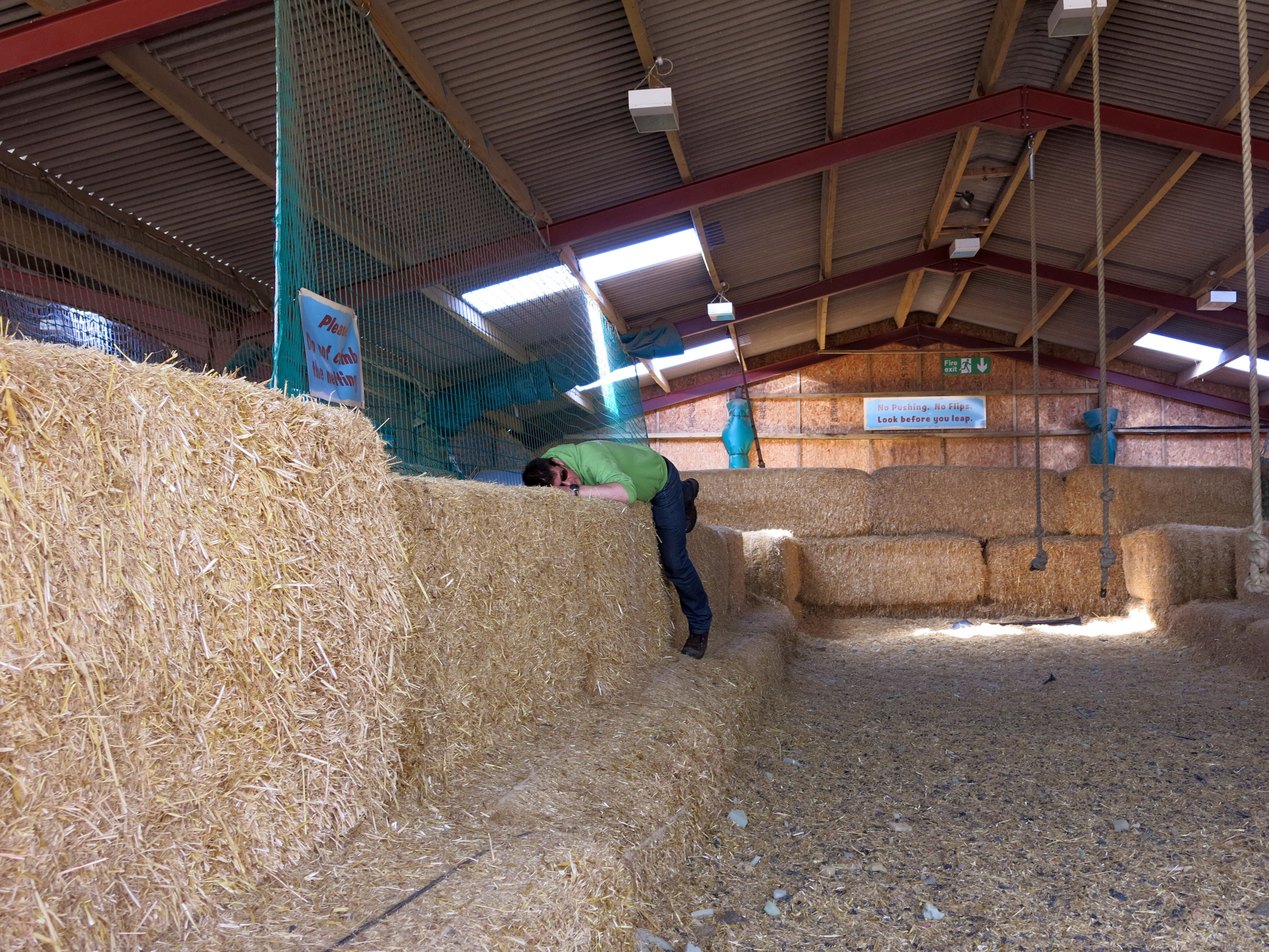 Am Weg blieben wir bei einer Bruecke stehen um unten am Fluss die Enten zu fuettern, die uns nach einiger Kennenlernzeit sogar aus der Hand fraßen. Und – natuerlich – in der Yorkshire Ice Cream Factory. Ich denke jetzt noch sehnsuechtig und mit Entzugserscheinungen zurueck an diese wunderbare Eiscreme. Ich muss sagen, mindestens genauso gut wie Red Boat. Ich hatte ‚Chocolat Fudge Brownie‘ (mit ganzen Brownie Stuecken) und ‚Key Lime Pie‘. Yum! Es gab auch ‚Birthday Cake‘, mit Kuchen- und Fondant Icing Stueckchen drinnen, das wurde gleich fuer den naechsten Tag eingeplant. Bei der Factory, die außen aussieht wie ne kleine Country-Stadt und innen einfach prototypisch Amerikanisch, gab es auch einen Heuschuppen mit Spielplatz, einmal fuer Kinder, und einmal fuer Erwachsene. Mit Heurutsche, Seilschwingen, und Heuballen zum Kraxeln und Runterhuepfen. Erinnerte mich an die Zeit, als ich noch nicht feige war, und Saltos von Heuballen ins Heu gemacht hatte. Heute war ich schon froh, ueberhaupt mal hinauf zu kommen. Besser noch als Rob, der kletterte mit seinem Beinmuskelkater muehsamst kompliziert hinauf und blieb gleich liegen.