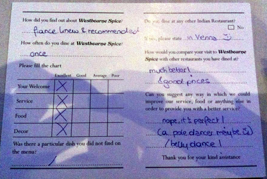 Anschließend fuhren wir zu Westbourne Spice, einem indischen Restaurant, bei dem wir noch dazu eine sehr nettes Feedback hinterliesen, das dem Kellner ein Grinsen ins Gesicht zeichnete…: