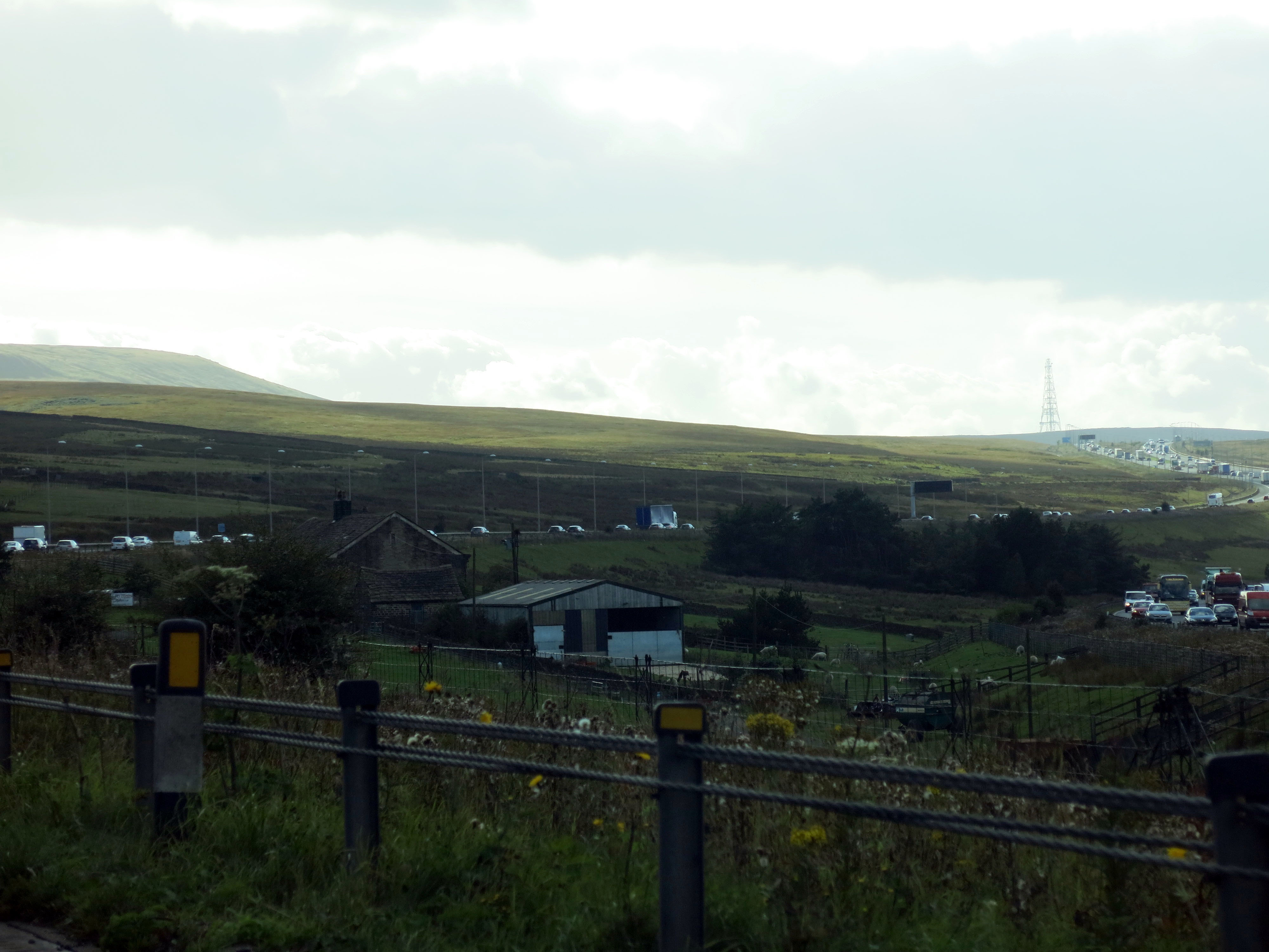 Tag 1 unserer Yorkshire Rundreise. Um 08:30 holte mich Rob ab und wir fuhren in sein Heimats-County. Am Weg dorthin gab’s schon die erste Sehenswuerdigkeit: Ein Haus mitten auf (zwischen!) der Autobahn. Ein Farmer hatte damals beim Bau etliche Milionen Pfund angeboten bekommen, wollte aber genau dort bleiben. Jetzt wurden die Spuren links und rechts von seinem Grundstueck gebaut, und inmitten der jeweils 3-Spurigen Autobahn steht nun eine Farm, mit Feldern und Schafen (die Armen!). Das nenn ich ein Statement!